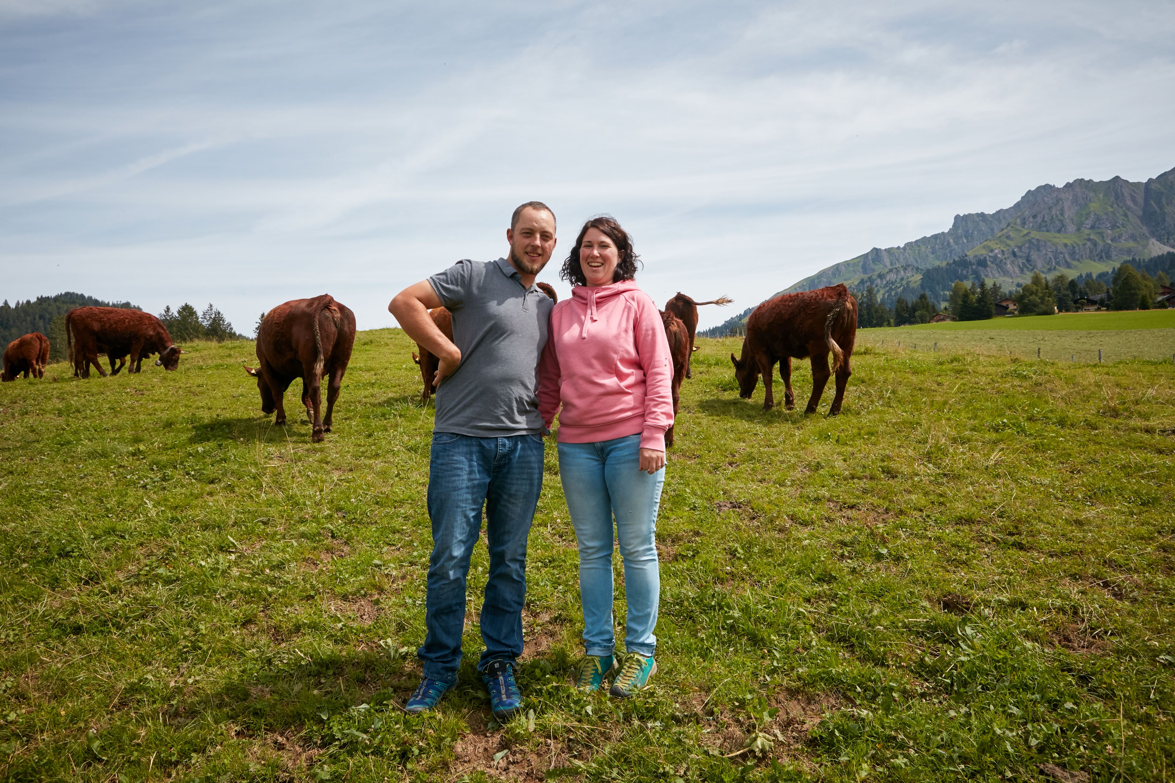 Les vaches de la Ferme de la Rosette sont nourries en hiver uniquement avec les fourrages issus des prairies de l’exploitation à Château-d’Œx. À la belle saison, elles pâturent les prés fleuris des Preises, un alpage situé aux Mosses.